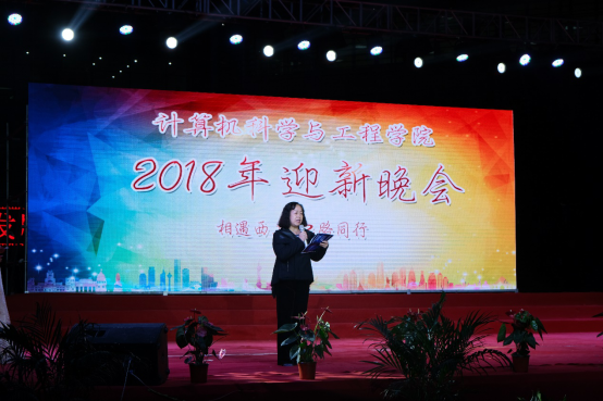晚会开始,首先由16、17级的学长学姐们带来的开场舞拉开了迎新晚会的序幕,强烈的节奏感,帅气的舞步,点燃了全场同学的激情,迎来了同学们的热烈掌声。计算机学院党委书记李晋慧老师致辞。