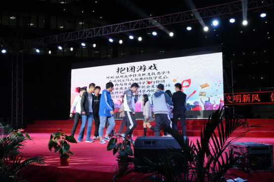 紧接着,各类节目陆续上演,晚会现场空前热烈,由方言演唱的《遇见》轰动了全场,不一样的唱法让全场同学的激情又一次高涨。伴随着动感的旋律,由一群小姐姐的舞姿《怦然心动》嗨翻全场。当同学们还沉浸在优美的舞姿中时,由学长学姐们带来的串烧《七月上》《夜空中最亮的星》迎来了全场尖叫喝彩。之后一名大一新生精彩戏曲,带我们体验到了戏曲的古韵,让我们体验到古代戏曲的精粹。然后精彩的小品《新盘丝洞》逗笑全场,武术更是让全场同学热血澎湃。当精彩朗诵《雨巷》过后,迎来了晚会的第一个小游戏数字抱团游戏,各个同学积极参与,场面极度热烈。