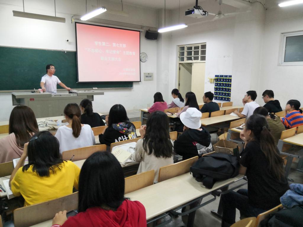 9月26日晚8:00,计算机学院学生第二、第七党支部在教3-209联合开展“不忘初心、牢记使命”主题教育,活动由第党七支部书记董元浩同志主持。