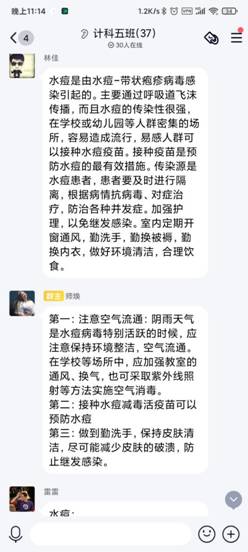 应学校和学院要求,计算机学院17级组织开展了一系列与水痘、出血热、肺结核有关的“保卫健康”教育活动,各班进行了线上宣传教育工作。
