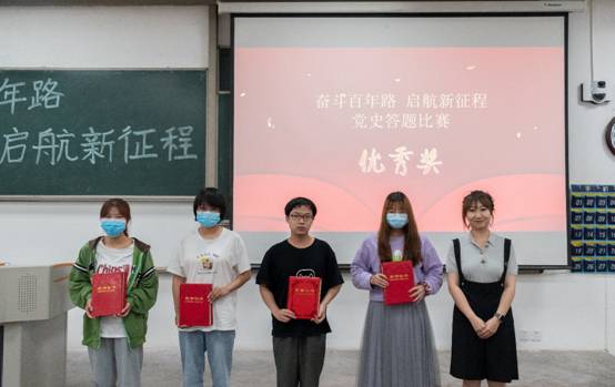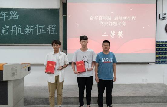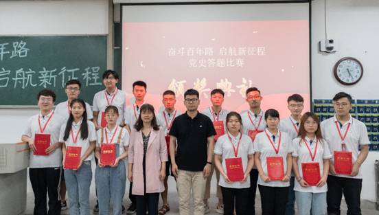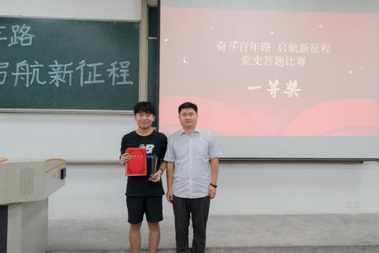 随后,计算机学院辅导员李凯、解军强、于杰及学生处处长助理何鹏程四位老师分别为荣获本次比赛的优秀奖、三等奖、二等奖及一等学生奖颁发奖杯及证书。计算机学院党委副书记李明芳、团委书记孙君两位老师为“e起学党史”团队成员颁奖并合影留念。