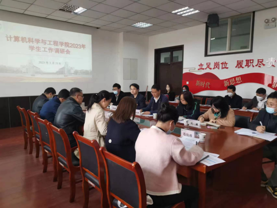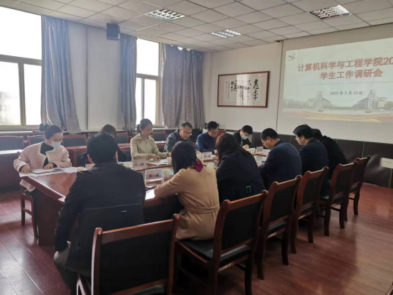 首先,计算机学院党委副书记靳永军从23年学院学生工作思路、六大工程建设、网络思政教育、辅导员队伍建设、毕业生就业等方面进行工作汇报。接着,副院长傅妍芳从研究生工作举措及学生就业等方面作了汇报。随后,全体辅导员分别就各自开展学生工作中遇到的问题以及职业发展面临的挑战与困难等逐一进行了沟通交流。各参会领导听取汇报和交流讨论后对计算机学院的学生工作给予了充分肯定并结合工作中相对不足的地方提出了指导建议。