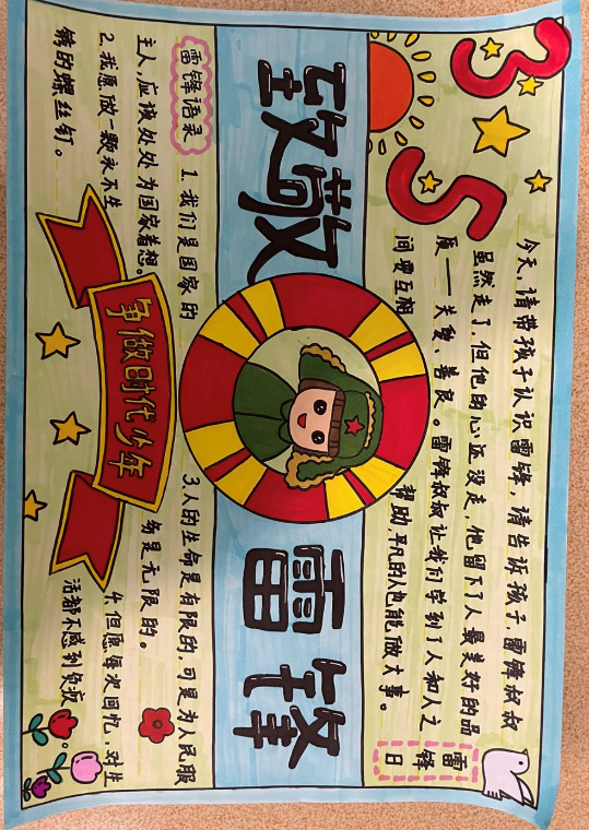 本次活动内容丰富、形式多样,吸引了大量同学的积极参与。通过手抄报的形式,同学们表达了对雷锋精神的理解和学习。一幅幅精美的作品,不仅色彩斑斓、图文并茂,而且内容充实,既有对雷锋生平的详细介绍,也有对“雷锋精神”的深刻感悟与传承思考。手抄报中的文字凝聚了同学们对雷锋精神的真挚敬仰,图画则生动诠释了大家对雷锋精神的理解。