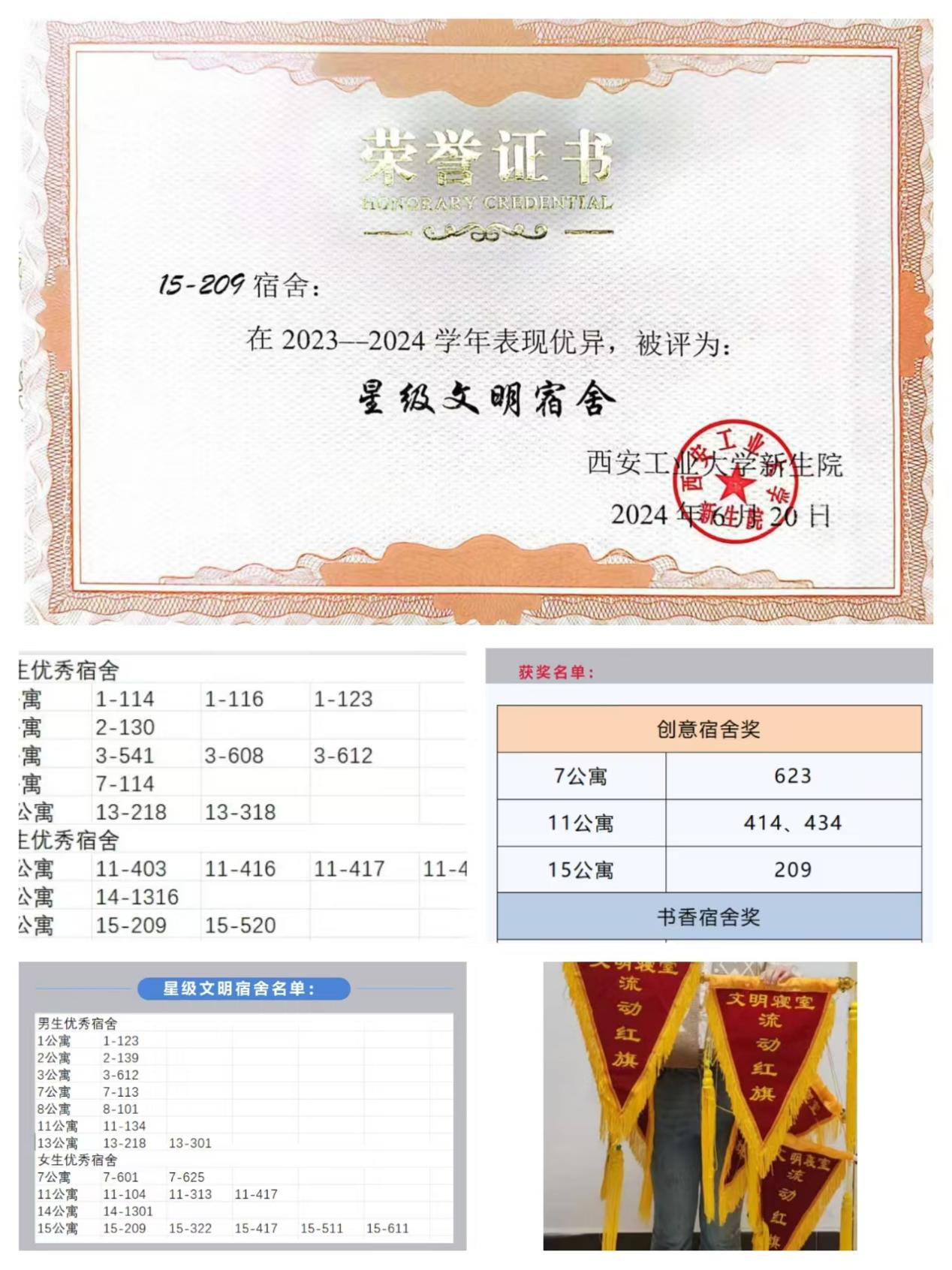 思想政治上,寝室成员积极向党组织靠拢,入党申请书递交率100%。一人参加了第3期青马班并顺利结业,4人参加了入党积极分子培训班并顺利结业,团日出勤率100%,青年大学习完成率100%。学习上,寝室成员学习氛围和谐,成绩良好,无挂科和重修现象,无任何违纪行为,平均绩点3.43。专业前十占比4人,专业前五占比2人。第二课堂平均分17.64分。课外实践上,宿会成员社会实践率100%,在2023-2024学年“寒假回访母校”社会实践中,被评为优秀队伍。寝室成员积极参与学校志愿活动,如迎新志愿、国际文化节志愿等。工作上,寝室五人担任班级干部及院学生会、社团等核心职位,在各个领域发光发热,受到师生一致好评。寝室建设上,15-209三次上榜“宿舍文明,室雅人和“星级文明寝室名单,三次荣获流动红旗,两次在XATU新生代公众号展示,在2023-2024年度被评为“优秀宿舍“。