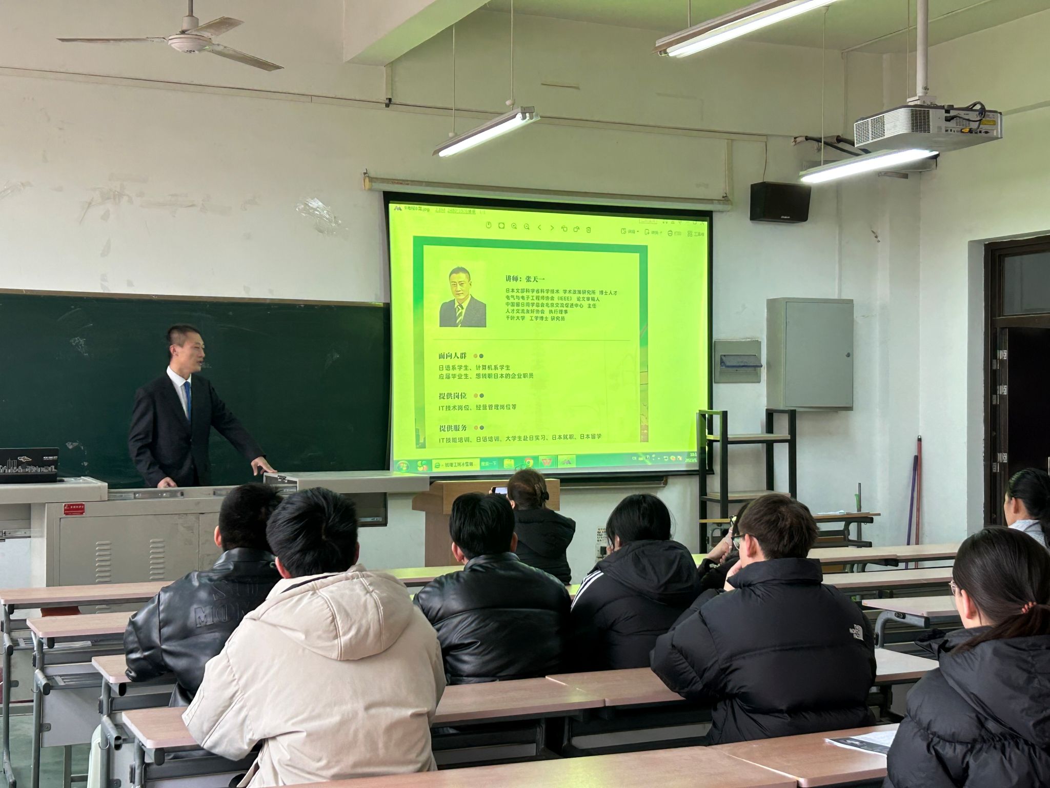 会议伊始,张天一以自身求学、求职经历作为切入,以“换个赛道,让梦想弯道超车”为题揭开了今日宣讲的帷幕。在各位同学的期待中,他分别从“为什么选择日本”,“日本短缺哪些IT人才”等话题为同学深入浅出地讲解了当今形式下日本IT行业的发展现状,前往日企工作所应具备的能力,生活基本花销以及在日企工作同学们所能得到的薪资水平等。