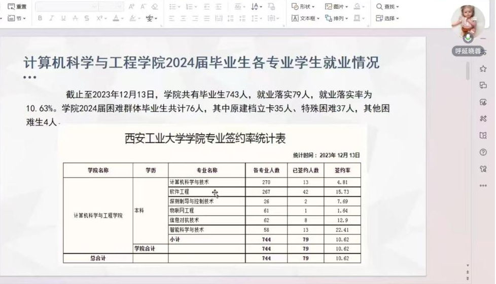 呼延老师先是详细分析了2024届毕业生各专业学生就业情况,并分享了学院的就业率数据,以及计算机学院的各专业签约情况,然后介绍了当前需就业学生自身存在的问题和就业现状。