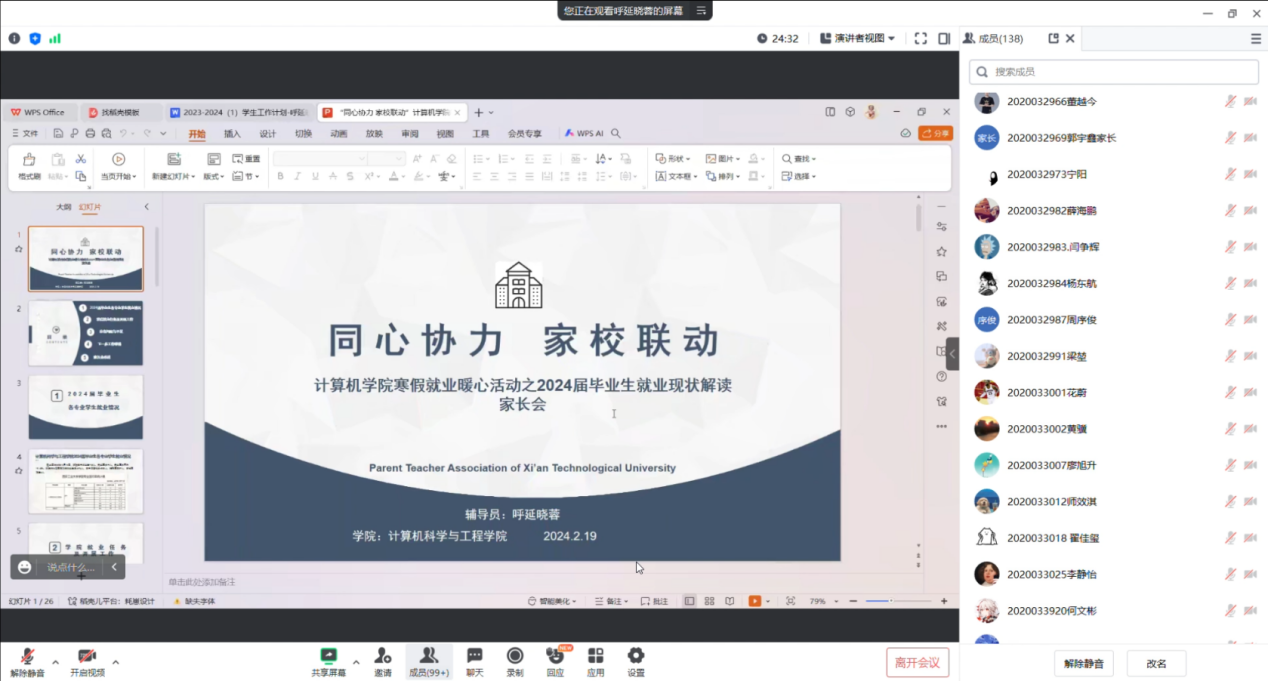 此次家长会圆满成功,通过此次活动,WilliamHill官方网站计算机学院进一步加强与家长的合作,共同为2024 届毕业生的就业工作努力。于此同时,解军强老师和胡凯老师也召开了线上家长会,为学生的就业问题提出相关建议,计算机学院将继续关注学生的需求,提供全方位的就业服务,助力毕业生实现自己的职业目标。