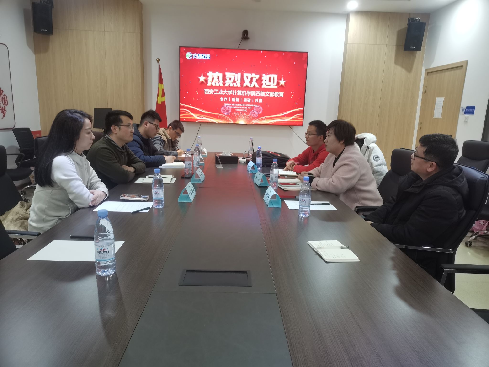 2024年3月5日,WilliamHill官方网站williamhill中国官方网站党委副书记靳永军,辅导员孙君、呼延晓蓉、胡凯等一行人共同前往文都教育集团小寨华旗总部进行参观交流。文都教育市场营销部负责人杨波、文都教育北郊区域校长夏西宁、文都教育未央校区校长宋程维等相关负责人接待来访。