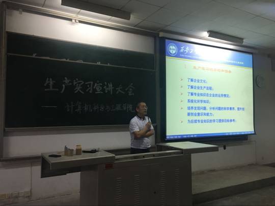 会议由计算机学院刘白林副院长主持,刘副院长在会议上向同学们详细介绍了参加生产实习的目的、意义及生产实习单位的具体情况;生产实习的时间安排和对同学们的要求。他强调:生产实习是帮助同学们实现学校与社会接轨的关键环节,有助于同学们了解自己所学专业知识在企业中的运用情况,深化同学们对未来求职岗位的理解,做好生产实习可以帮助同学们切身了解企业的文化,企业的生产流程,并进一步强化自己的专业知识,培养自己发现问题、分析问题、解决问题的科学素养,提升自己创新创业的意识和能力,并为回校后进一步的专业学习提供目标参考。