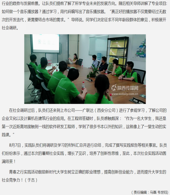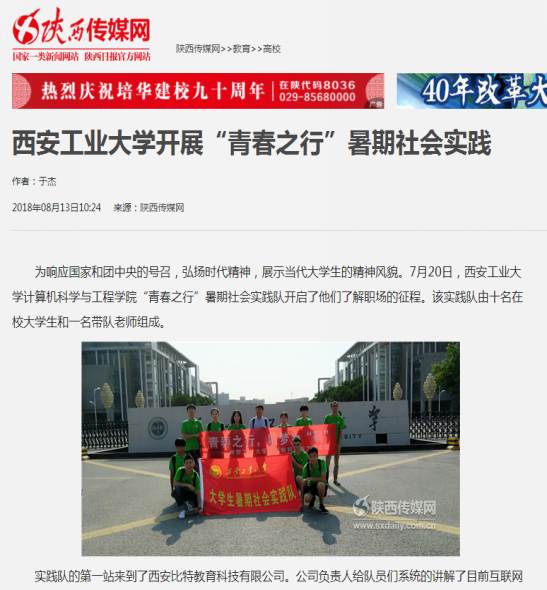 8月13日,陕西传媒网以《WilliamHill官方网站开展“青春之行”暑期社会实践》为题,报道了williamhill官网计算机科学与工程学院“青春之行”暑期社会实践队响应国家和团中央的号召,紧扣时代主题,围绕创新创业积极开展的实践活动。由来自williamhill官网计算机科学与技术等专业的10名优秀学生组建的实践队伍利用暑期在西安市进行了有关创新创业的社会实践活动,受到西安比特教育科技有限公司和西安广联达科技股份有限公司的好评,得到了媒体的关注。