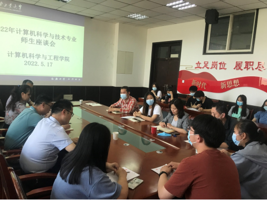 为更好的服务学生,解决学生在日常教学、学习、生活等方面的问题,落实“以学生为中心”工作理念,2022年5月17日中午12:30,计算机学院召开计算机科学与技术专业期中教学师生座谈会,学院党委副书记靳永军、副院长刘宝龙,专业负责教师赵宇峰、王辉,实验室主任魏亭及教学秘书、辅导员和18名学生代表参会。