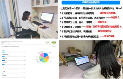 刘宝龙老师以“一码通崩溃的原因是什么?”从专业角度分析后,引出《数据库原理与应用》的课程介绍,巧妙进入授课阶段。王辉老师以多选题“网络直播授课时发生卡顿等现象是受哪些因素影响?”自然而然引入《计算机通信与网络》课程;马静老师以“你能选出计算机的基本组成吗?”巧妙引入《计算机组成与体系结构》课程;赵宇峰老师以大家耳熟能详的HTTP、IP地址等设问引入《计算机通信与网络》课程;激发学生兴趣,互动效果良好。耿军雪老师在《算法设计与分析》的第二节课下发选择题,要求学生限时计算,确保学生们按时上课和有效听讲。叶昕老师在《编译原理》课程中用一个小例子对比编译和解释的区别引入课程。