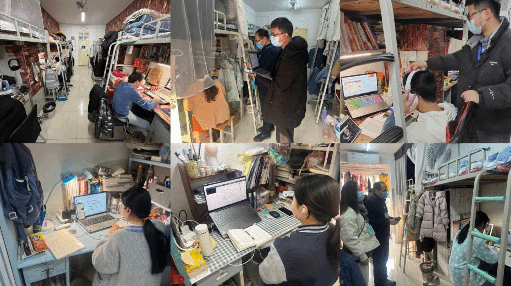 今天是新学期线上教学的第一天,全体辅导员深入学生宿舍巡课,了解学生学习情况、解决学生实际问题,及时回应学生诉求。针对部分学生反映的宿舍网速差、上课链接打不开的问题,计算机学院第一时间上报问题、并与信息中心沟通,经过现场重新配置网络连接,学生宿舍网速恢复正常,线上课程得以正常进行。