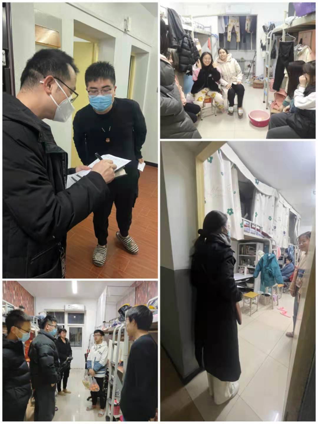靳永军带领办公室主任焦建军、全体辅导员,分岗位、明职责,多次深入学生宿舍,检查宿舍卫生、通风情况,安抚学生情绪,讲解强调疫情防控政策,询问学生学习和生活上存在的实际困难,并多方协调、予以解决。通过持续不断的走访,学生诉求得到及时回应,焦虑情绪得到纾解;同学们纷纷表示,将严格遵守学校的各项规章制度,从我做起,听从指挥,为疫情防控尽一份力;同学们整体精神面貌得到极大提升,核酸检测等各项工作迅速有序开展。