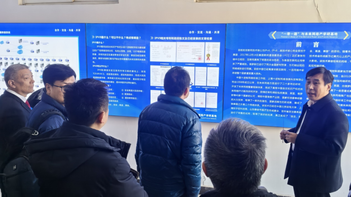 汇报会议之前,柏司长一行及WilliamHill官方网站副校长陈建参观一带一路与未来网络产学研基地,基地负责人王中生全程讲解IPV9重大技术及应用现状。