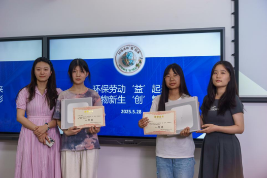活动期间,各个参与者将家中闲置物品(如旧衣物、废弃塑料、电子零件等)进行创意改造,赋予其新的使用价值。其次此次活动进行了旧物DIY手工展示(如废旧布料改造、塑料瓶艺术创意),个人作品展示或者PPT形式介绍等环节,各个同学积极展示各自作品。在进行评选过后,分别由王思语、王艺洁、折柯阳为获奖同学颁奖。
