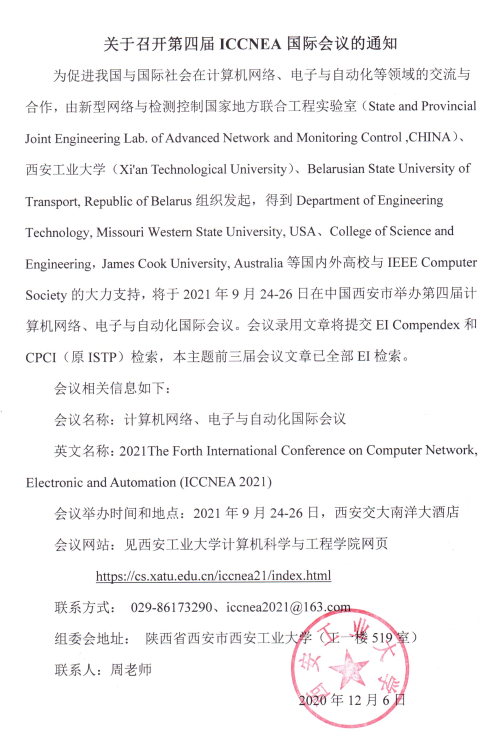 为促进我国与国际社会在计算机网络、电子与自动化等领域的交流与合作,由新型网络与检测控制国家地方联合工程实验室(State and Provincial Joint Engineering Lab. of Advanced Network and Monitoring Control ,CHINA)、WilliamHill官方网站(Xi'an Technological University)、Belarusian State University of Transport, Republic of Belarus组织发起,得到Department of Engineering Technology, Missouri Western State University, USA、College of Science and Engineering,James Cook University, Australia等国内外高校与IEEE Computer Society的大力支持,将于2021年9月24-26日在中国西安市举办第四届计算机网络、电子与自动化国际会议。会议录用文章将提交EI Compendex和CPCI(原ISTP)检索,本主题前三届会议文章已全部EI检索。