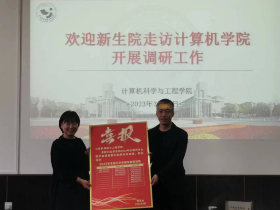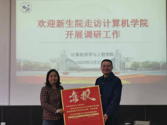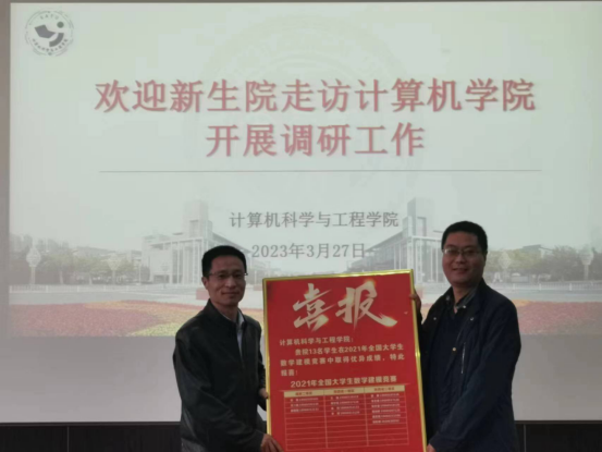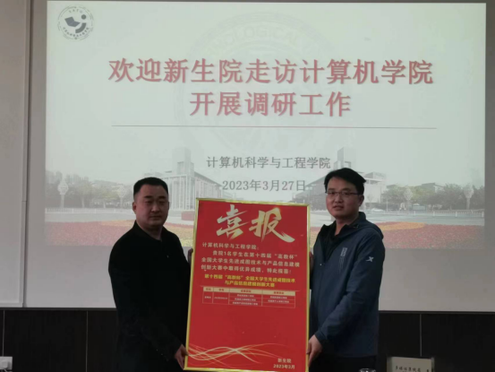 会后,新生院赠与计算机学院学生参加数学建模、工程制图等竞赛的获奖喜报,双方学院领导共同合影留念。