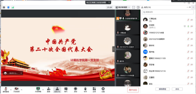 2022年10月21日19点,计算机学院学生第一党支部开展“贯彻落实党的二十大精神”党日活动,参会人员有支部书记呼延晓蓉,正式党员、发展对象以及所有积极分子。