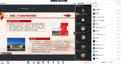 活动开始,党支部副书记王佳钰对二十大背景及会议主题进行了介绍,使大家对中国共产党第二十次全国代表大会有了更多的认识和了解。党支部书记呼延晓蓉带领大家学习了大会报告中的“关键词”:两步走,必由之路,中心任务,第一要务,重大原则,着力点,全过程人民民主,依法治国,社会主义文化,完善分配制度,新型能源体系,更高水平的平安中国,战略性工作,战略威慑力量体系。呼延晓蓉强调,我们应坚持用党的科学理论武装青年,用党的初心使命感召青年,做青年朋友的知心人、青年工作的热心人、青年群众的引路人。