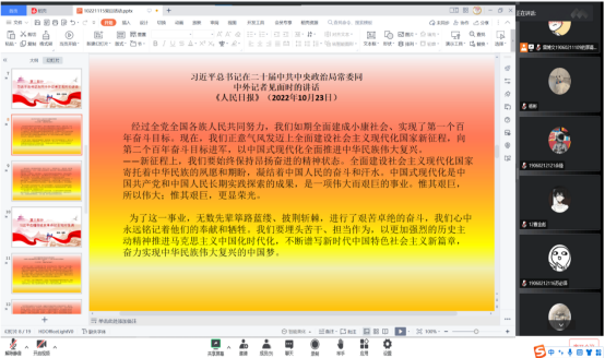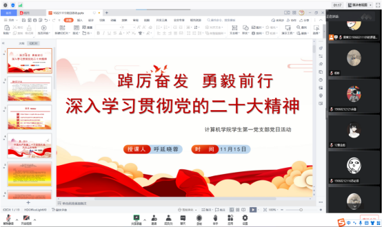 为深入学习宣传贯彻党的二十大精神,计算机学院学生第一党支部在11月15日下午19:00开展主题为“踔厉奋发、勇毅前行,深入学习贯彻党的二十大精神”的党日活动。考虑到当前疫情防控形势,本次党日活动采用线上会议的方式进行。参会人员有党支部书记呼延晓蓉,正式党员和发展对象。会议由党支部副书记王佳钰同志主持,首先对会议议程进行简述,明确会议学习内容。