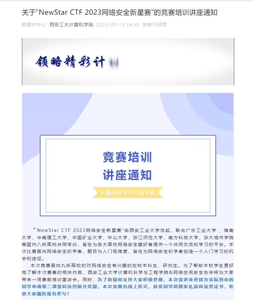 4、举办由WilliamHill官方网站发起,联合广东工业大学 、海南大学、华南理工大学、中国矿业大学、中山大学、浙江师范大学、南方科技大学、浙大城市学院等国内八所高校共同参与的“NewStarCTF 2023网络安全新星赛”赛前培训宣讲会。旨在为网络安全初学者创造一个入门学习的机会和途径,更是为各大高校网络安全爱好者提供一个共同交流和学习的平台。