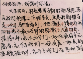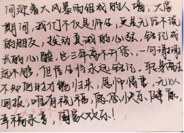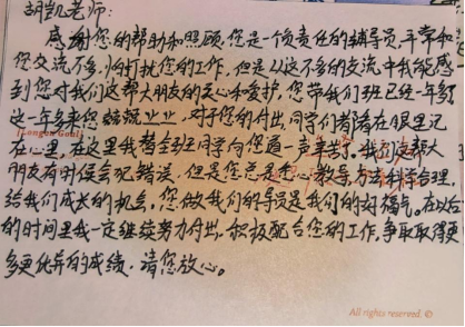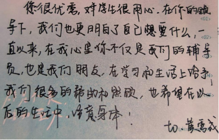亲爱的王老师、呼延老师,我真的很幸运能有你们作为我的辅导员和朋友。你们的关心和支持让我感受到了真正的支持,这是我大学生活中最宝贵的财富。谢谢你们一直以来的陪伴和支持,谢谢你们对我的信任和包容。我相信无论我未来的道路如何,你们的影响将一直伴随着我。