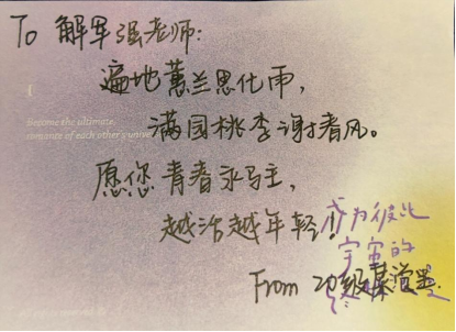 您总是让我感动。您不仅会传授专业知识,还时常关注我们的心理健康和生活状态。在我感到压力和迷茫的时候,您总是会开导我、鼓励我,并给我提供实际有效的帮助。您像一盏明灯,为我照亮前行的道路。我很感激您的指导和关怀,这些都让我更加坚定了自己的目标和信念。