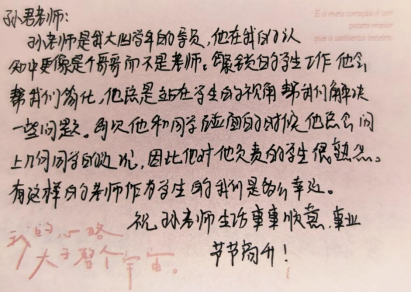 孙君老师是我大四学年的导员,他在我的认知中更像是个哥哥而不是老师,繁琐的学生工作他会帮我们简化,他总是站在学生的视角帮我们解决一些问题,每次他和同学碰面的时候他总会问上几句同学的近况,因此他对他负责的学生很熟悉,有这样的老师,作为学生的我们是多么幸运,祝孙老师生活事事顺意,事业节节高升!