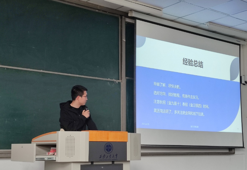 第四位分享者是williamhill官网2019级学生孟瑞杰,他指出打算就业的同学可以实习等秋招或者实习一年转正。他说分配到的面试岗位是很重要的,所以我们一定要重视求职就业的各个环节。我们要注意简历照片要证件照,要很标准的,不可以敷衍了事,同时也要注意面试用语,给面试官留下好的印象,简历就是要体现个人能力的,他认为竞赛获奖>项目经历>实习经历。最后鼓励学弟学妹用坚持不懈的行动和艰辛的汗水追逐个人理想。